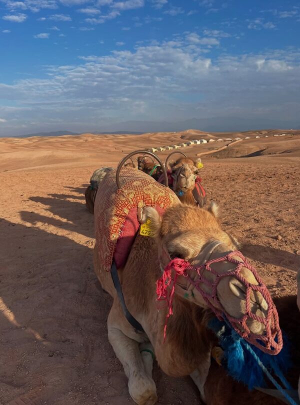 Immerse yourself in the timeless charm of the Palmeraie with a 1-hour camel ride at sunset. Dressed in traditional nomadic attire, you will sway gently atop your camel while exploring palm groves, desert trails, and authentic landscapes. As the sun sets, the sky is painted with warm colors, creating a magical backdrop for your adventure. This is the perfect activity for those seeking a peaceful and cultural experience near Marrakech.